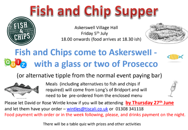 Please join us at the Village Hall on the 5th of July (from 6PM) for what threatens to be a classic Askerswell evening of fish, chips, pies, prosecco and pea fritters!!! and a bar… and a Quiz!!! Village life can’t get any better than this, can it?? Please see the flyer and menu attached – and let David and Rose know that you will be attending (by the 27th of June) and give them your order…
