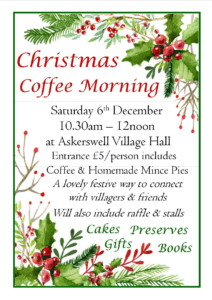 Donations of homemade cakes, jam, chutney or any other produce; and unwanted gifts and books which might make good Christmas presents (or just need to find a new home) will be gratefully received to sell at the event. These can be left in advance with any of the Village Events Group (currently Rose, David W, Ali or Morag).