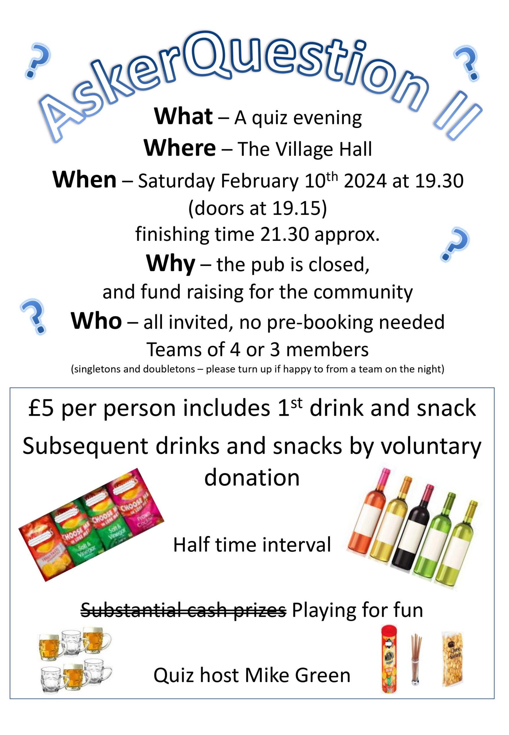 The V.E.G have organised for a fun quiz night in the village hall. If you are available, come and join in the fun on the 10th of February at 19:30.